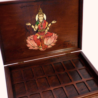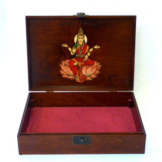 The outside of this heirloom collector's chest features a delicately tinted lotus blossom. The artwork on the inside is even more stunning: Lakshmi rests on another lotus, also in full color.